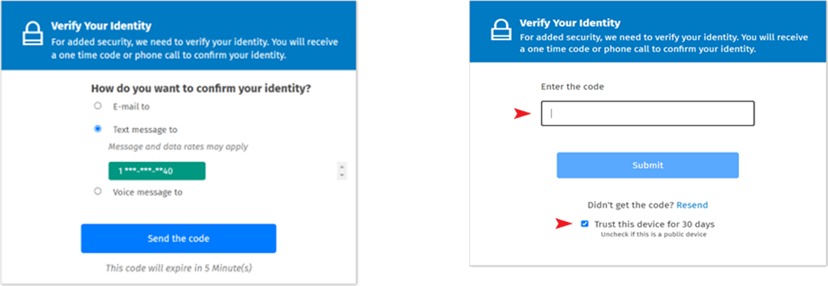 5. Complete Two-Factor Authentication - You'll need to verify your identity through a code sent to your email or via text. Check the box next to “Trust this device for 30 days” if you prefer not to submit a code each time you log in.