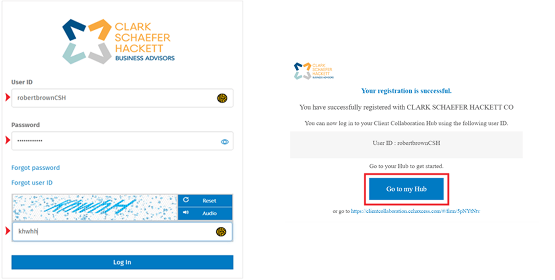 4. Log In - After registration, you should be directed to a login screen. Enter your User ID, Password, and CAPTCHA code. If you are not automatically redirected, click Go to my Hub in your account setup confirmation email.