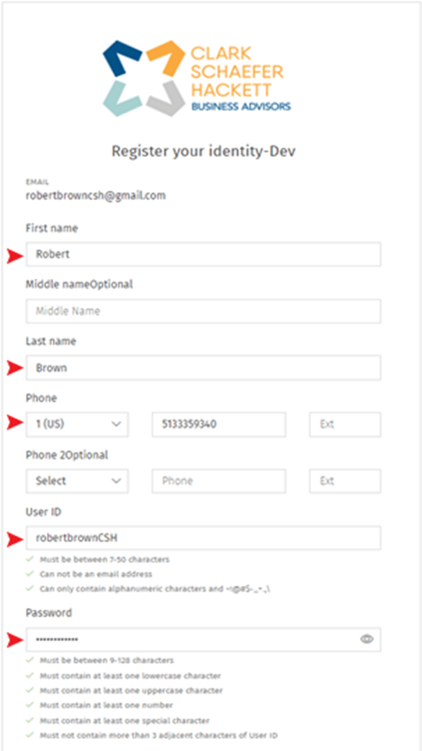 3. Input Needed Information - Complete the required fields, including User ID and Password. Your User ID cannot be an email address. Once you've populated the necessary information, click Register at the bottom. You'll receive a confirmation email once your account is registered.