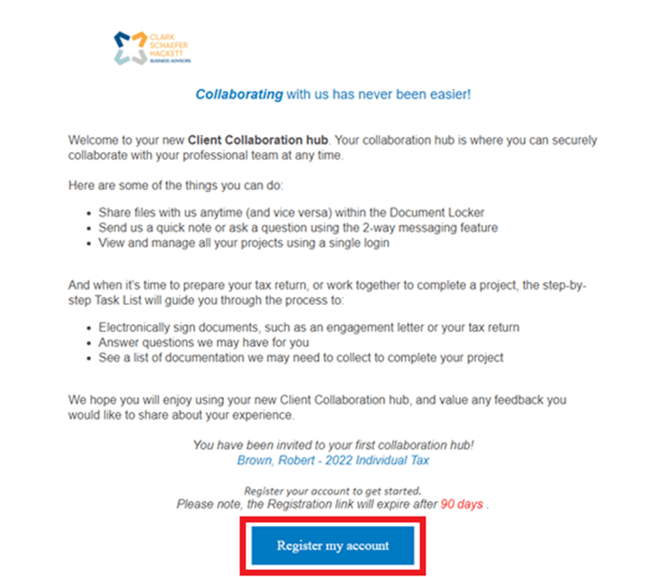 1. Check Your Inbox - Keep an eye out for an email from [email protected] with the subject line: CLARK SCHAEFER HACKETT CO invites you to the Client Collaboration Hub. If you don't see the invitation in your main inbox, please check your Spam folder.
