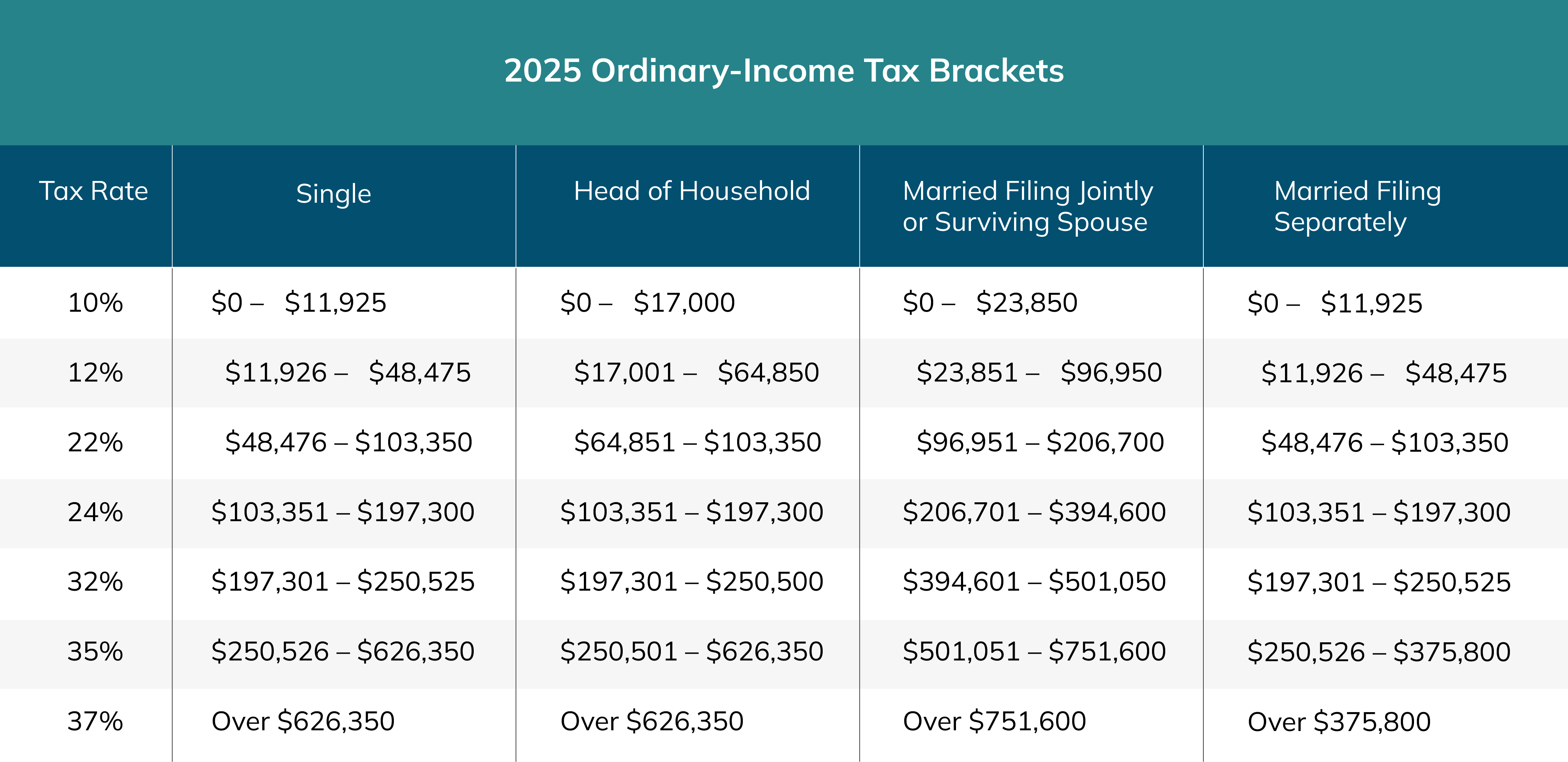 Tax-bracket thresholds increase for each filing status, but because they’re based on percentages, they increase more significantly for the higher brackets. For example, the top of the 10% bracket will increase by $325–$650, depending on filing status, but the top of the 35% bracket will increase by $10,200–$20,400, again depending on filing status.