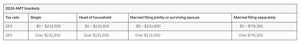 Like the regular tax brackets, the AMT brackets are annually indexed for inflation. In 2024, the threshold for the 28% bracket will increase by $11,900 for all filing statuses except married filing separately, which will increase by half that amount.