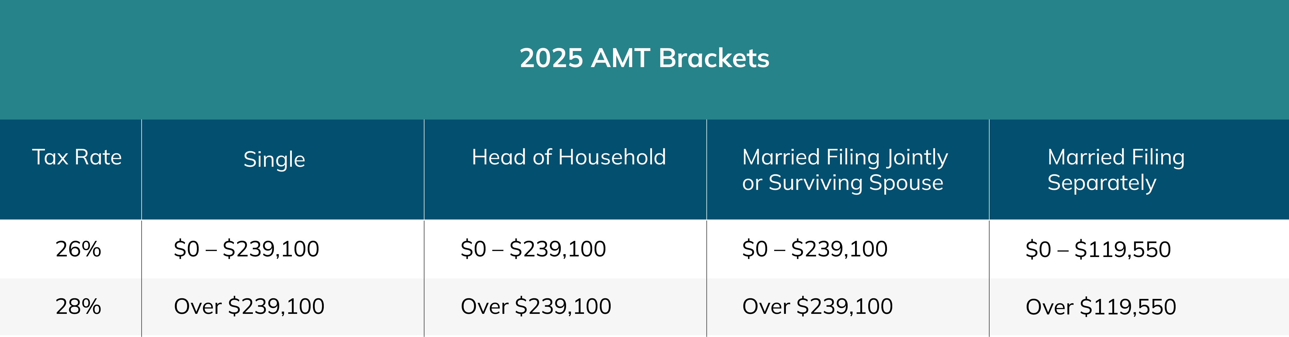 Like the regular tax brackets, the AMT brackets are annually indexed for inflation. In 2025, the threshold for the 28% bracket will increase by $6,500 for all filing statuses except married filing separately, which will increase by half that amount.